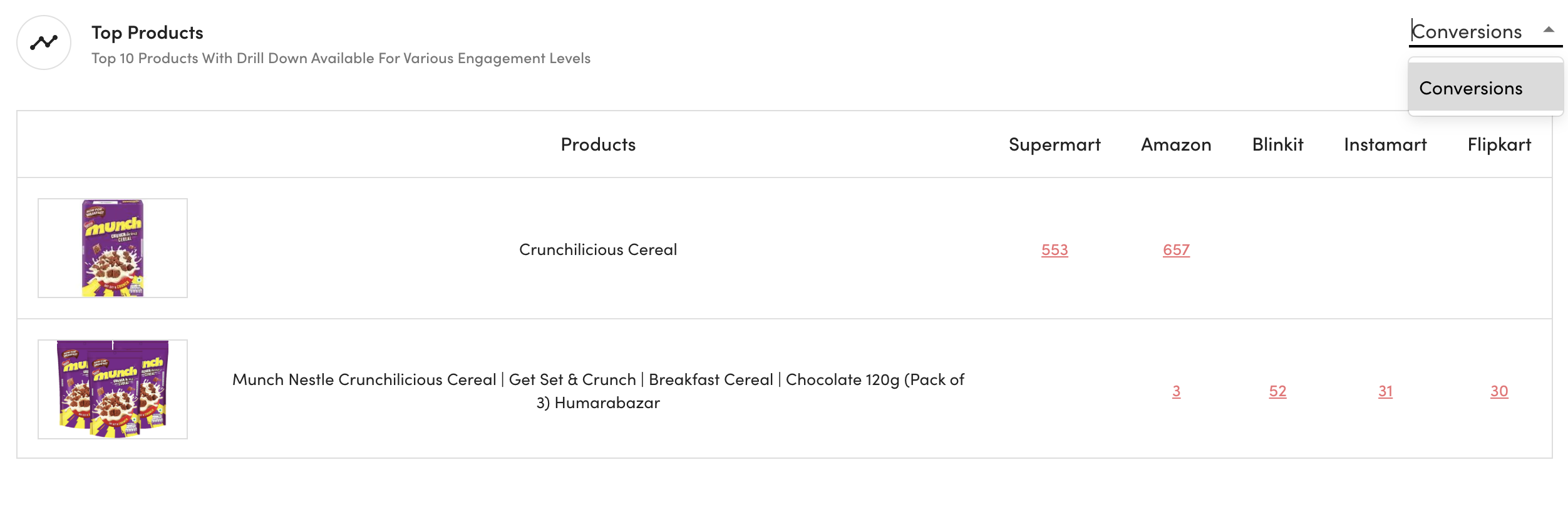 Top Products: This gives you the count of the top 10 products with respect to the number of clicks on the “BUY NOW” button across various retailers consolidated.