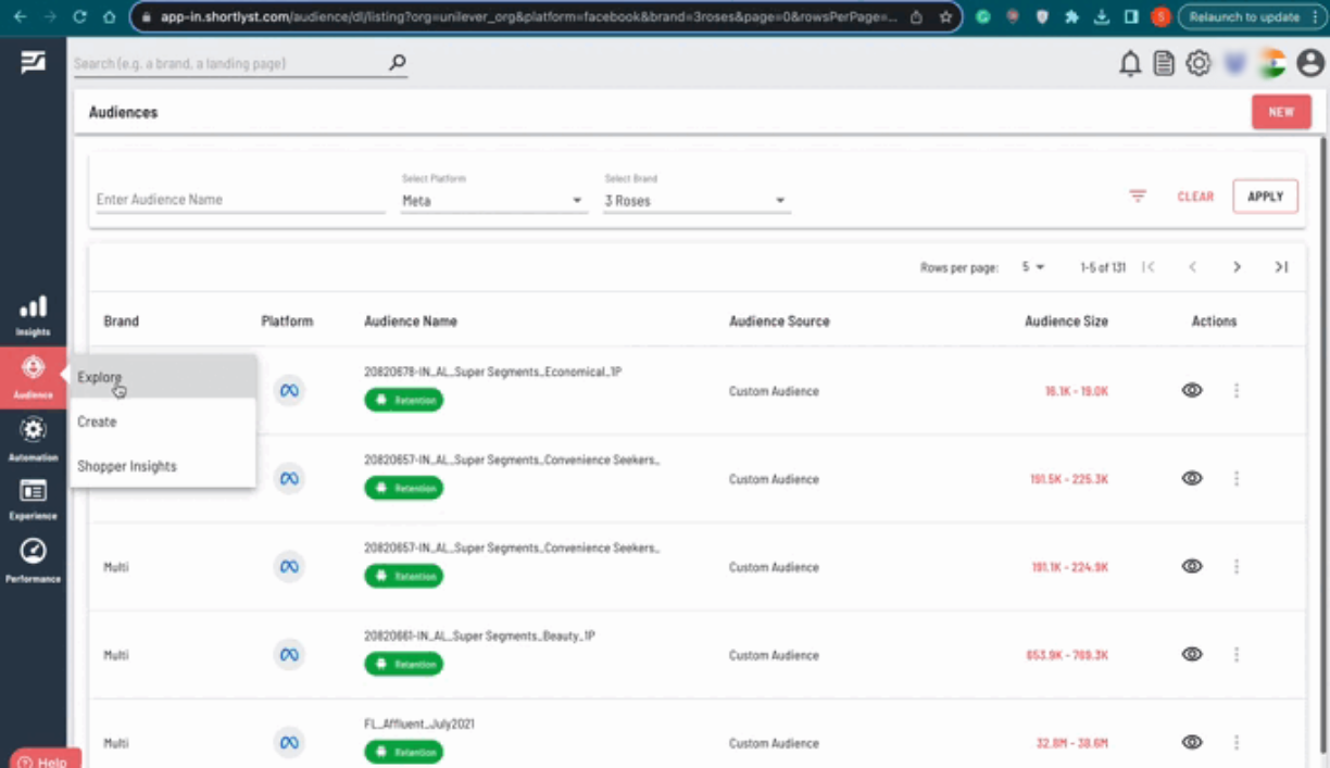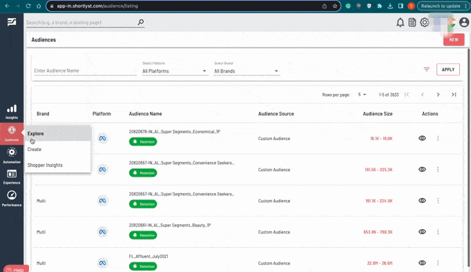 The audience listing screen helps you filter the saved audiences based on the Brand and Ad Platform along with the audience sizing and the source of the audiences. Find the instructions to create your first audience in this article