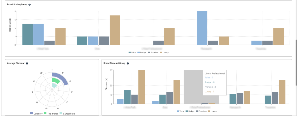 Average discount: This section enables you to compare the average discount percentage of your brand vs the top brands in the category vs the category average discount itself.