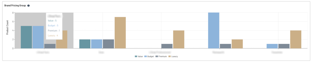 Brand pricing group: This section shows the top 5 brands inclusive of the selected brand with the product count in the 4 pricing bands.