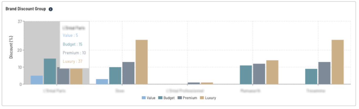 Brand discount group: This section shows the top 5 brands inclusive of the selected brand with the discount% in the 4 pricing bands.