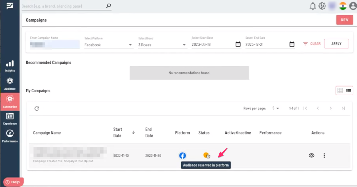 | Campaign inactive in platform | ![]() | The audience for the campaign has been reserved |
