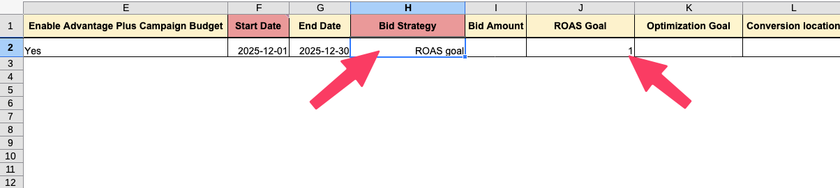 - In the media plan input sheet, fill “ROAS goal” as the Bid Strategy.