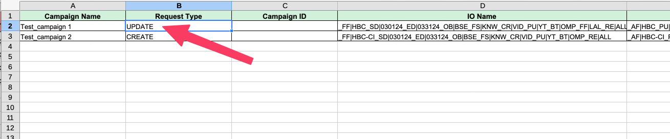 - Add rows corresponding to the new entities you want to create (Insertion Order / Line Item / Ad Group / Ad) and set it's Request Type to UPDATE